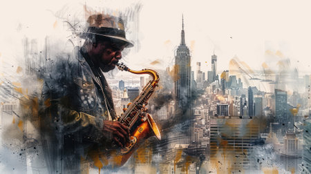 A talented saxophonist immersed in music, captured in a dynamic and colorful performance