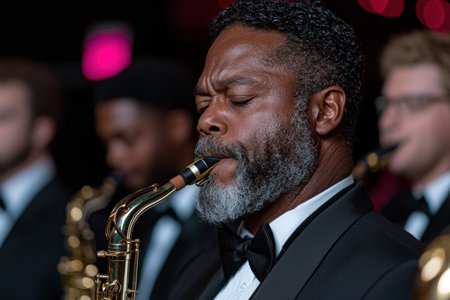 Jazz Saxophonist Performing with Passion on Stage, Illuminated by Atmospheric Lighting
