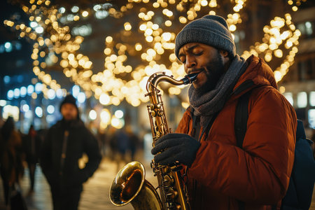 A talented saxophonist performs on a busy street, surrounded by festive lights and evening crowds.