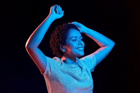 african american woman dancing over neon lights
