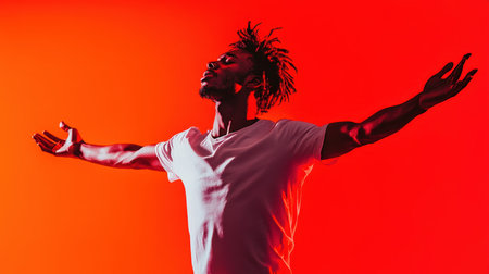 A man stands with arms wide open, facing upward against a striking red background. His expression conveys a sense of liberation and emotion, capturing a moment of self-expression and creativity.