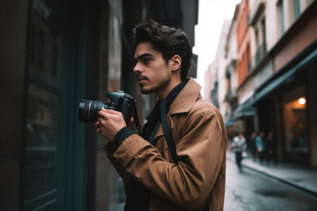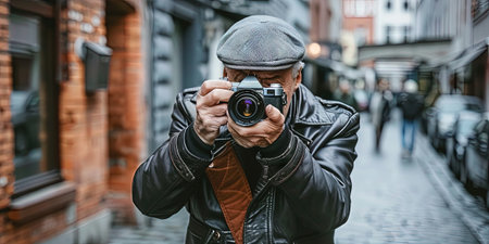 Professional photographer taking picture in the city. Man in hat and leather jacket.