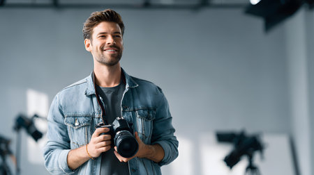 A young male photographer in a bright studio, smiling and holding a professional camera, surrounded by soft light and modern equipment in the background.