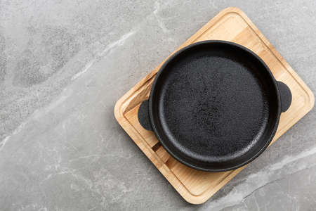 empty cast-iron pan on a wooden board and a gray marble table top view, kitchen table with dishes for frying meat flat lay