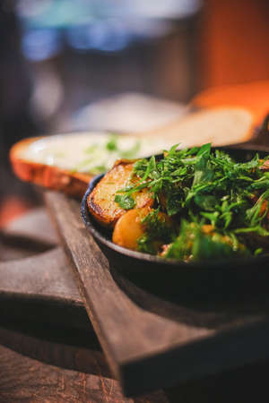 Roasted potato in a frying pan, close up view