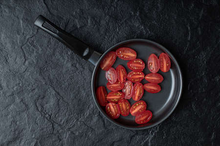 Half cut fresh cherry tomatoes on black frying pan on black background