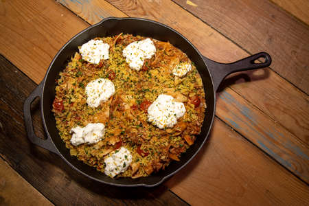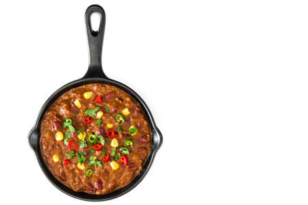 Traditional mexican tex mex chili with meat in a frying pan isolated on white background