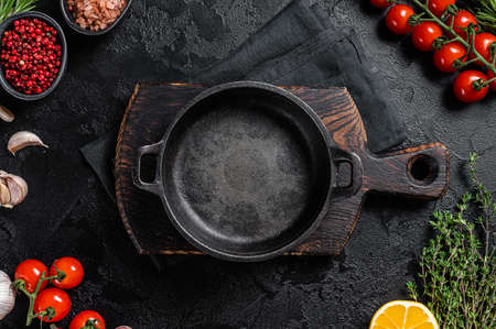 Empty black frying pan on black background. top view Copy space.