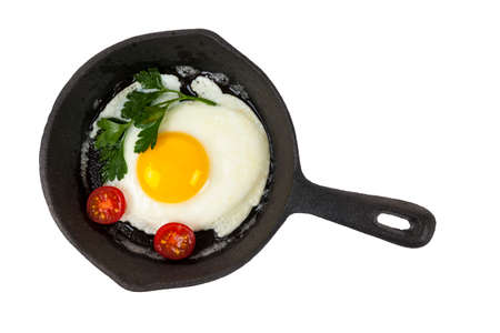 Black cast iron frying pan with fried egg isolated on white background, from above