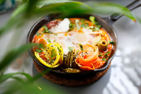 Shakshouka, fried eggs in a pan with vegetables and tomatoes. Breakfast, eggs with vegetables served in a pan.