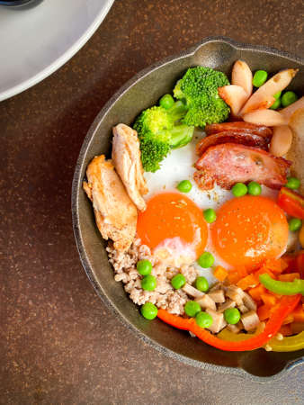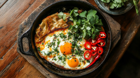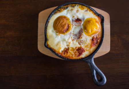 fried eggs baked breakfast served in cast iron fry pan on wooden tray