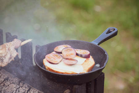 Cooking of fire in a fireplace. Frying a sandwich from bun, brie cheese and fresh sliced tomatoes. Selective focus on the food, blurred background.