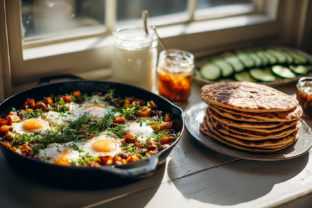 Warm morning light illuminates a charming breakfast setup with a vegetable-topped baked egg skillet, layered flatbreads, crisp cucumber slices, and small jars of cream and fruit pr