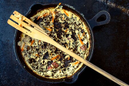 Empty pan after eating scrambled eggs with a wooden fork. Omelet leftovers