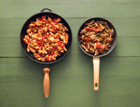 Frying pans with tasty Fajita on color wooden background