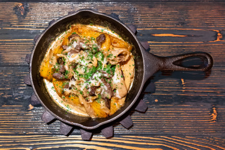 An old frying pan with fried potatoes, mushrooms and sauce. flat lay. Homemade food, rustic cuisine.