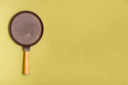 Cast-iron pancake pan with wooden handle. pancake day. Space for text. copyspace.