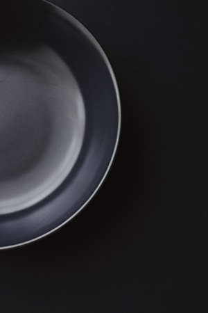 Empty black metal plate on a black background .. Top view. Close-up.