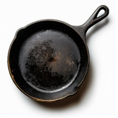 A vintage cast iron skillet with a weathered surface, adding character and charm. Perfect for culinary enthusiasts and decorative kitchen settings.
