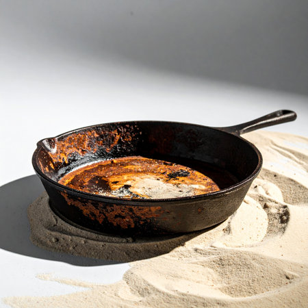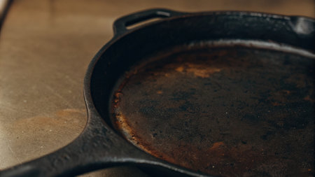 Worn cast iron skillet on a rustic kitchen surface.