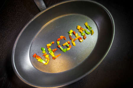 Vegan word written with chopped vegetables on a pan on a table