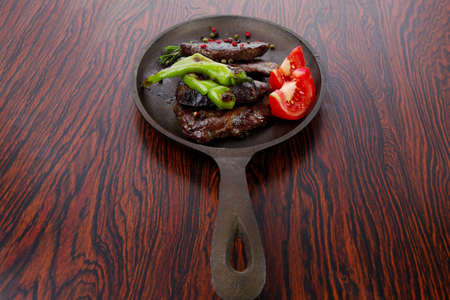 fresh roast beef fillet mignon on old retro style cast iron pan on retro wooden table as background with rosemary peppercorn and tomatoes