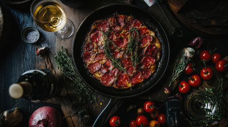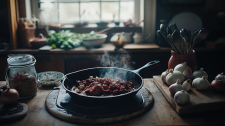 A cozy kitchen scene featuring a cast-iron skillet with sizzling meat, surrounded by fresh ingredients like onions and garlic, capturing the essence of home-cooked meals