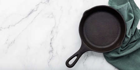 Empty old cast iron skillet set up on white marble background with flat lay and copy space.