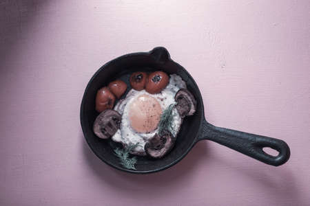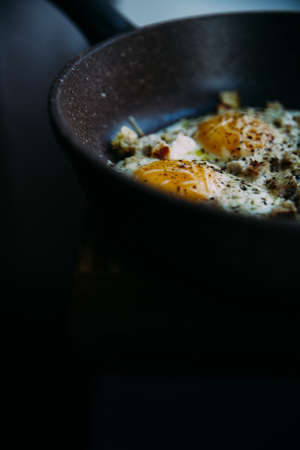 fried eggs in a frying pan, with cheese and chicken, stylish serving of dishes in a cafe and restaurant