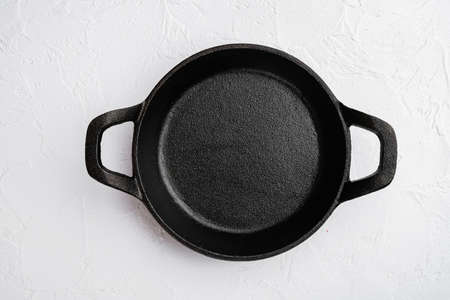 Empty cast iron skillet set with copy space for text or food with copy space for text or food, top view flat lay, on white stone table background