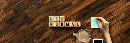 cubes with message NEW NORMAL and hand taking notes on wooden background