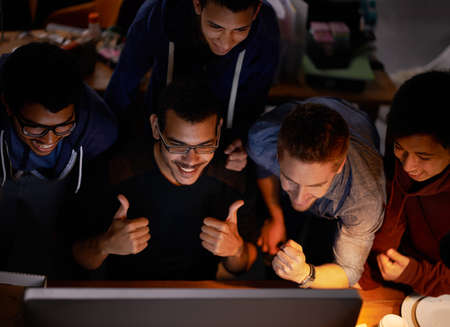 Were gonna win boys. Shot of a group of young man cheering at a monitor in a dark room.