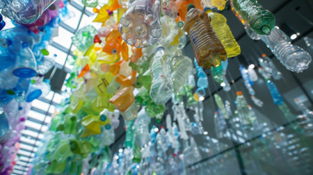 A recycled art installation made from repurposed plastic bottles and bags hangs from the ceiling reminding visitors of the impact of singleuse plastic