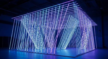 Individuals gather in a contemporary art gallery illuminated by dynamic lights and floating displays, creating a visually striking atmosphere for cultural engagement.