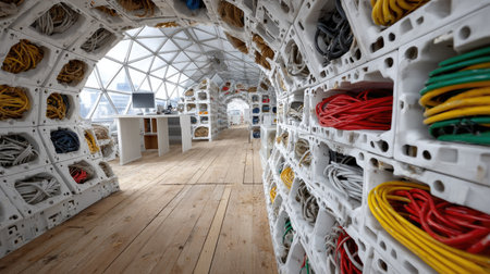 This image features a unique modern workspace organized with colorful cables inside a geodesic dome, showcasing innovative design and creativity.