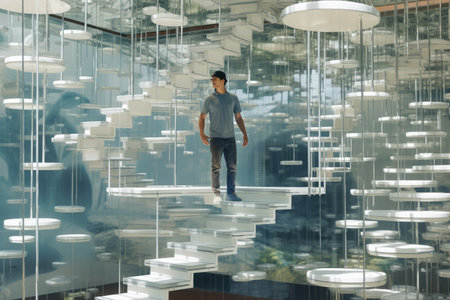 Smart man exploring a surreal museum of floating white frames. Art installation and optical illusion concept. Attractive people walking up white floating staircase surrounded with square box. AIG35.