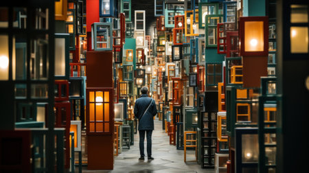 A person stands in awe in front of a mesmerizing display of sparkling lights, Cluster of holographic projections transformed into an abstract display, AI Generated