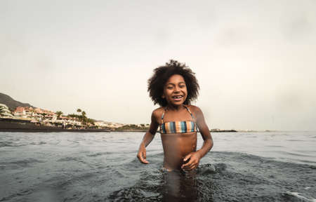 Happy Afro child having fun playing inside water during summer time - Childhood and vacation concept