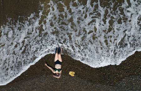 Woman with swimsuit resting on a sandy beach with braking waves on the shore. Overhead shot. Aerial drone photograph