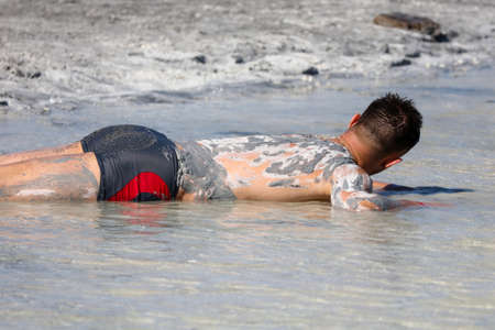 A man with mud on his skin by the sea.