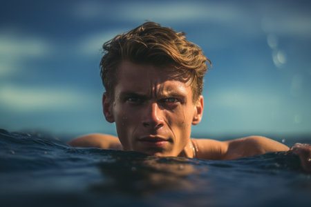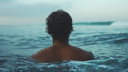 A man in the water with his head above, capturing a moment of tranquility. Suitable for themes related to relaxation, swimming, and leisure activities.