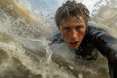 A young surfer embraces the thrill of riding waves, showing his skills and passion. Saltwater sprays all around as sunlight glimmers on the horizon, capturing an exhilarating moment of adventure.