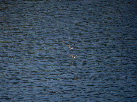 A pair of common sandpiper, Actitis hypoleucos, flies over the Saza river in Nagasaki Prefecture, Japan