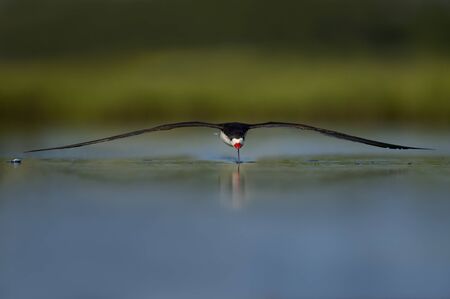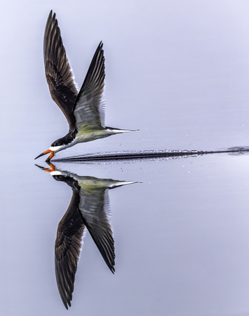 Black Skimmer flies low over the water dragging its bill in the water with its reflection and a smooth background in early morning sunlight.