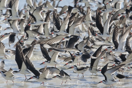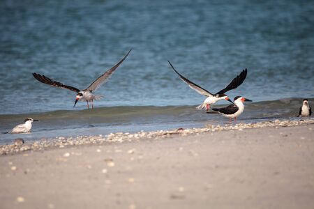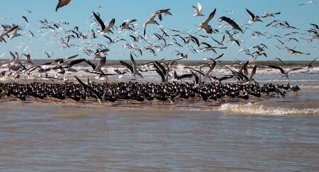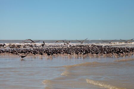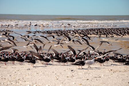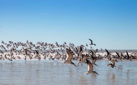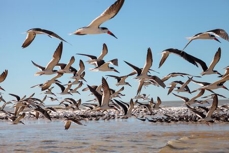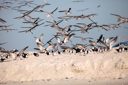 Flock of black skimmer terns Rynchops niger on the beach at Clam Pass in Naples, Florida