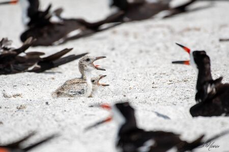 Black skimmer baby chicks in their nest cooling off by opening their beaks