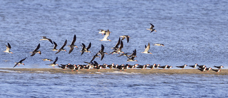 Flock of Black Skimmers flying over sand bar