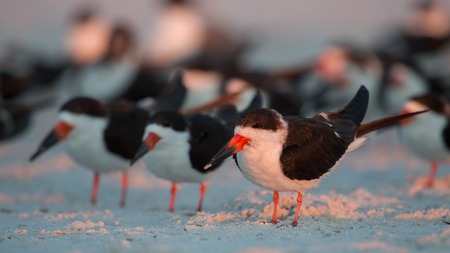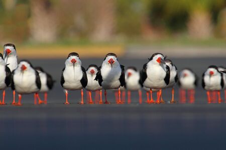Flock of Black Skimmers (Rynchops niger) with bright orange legs