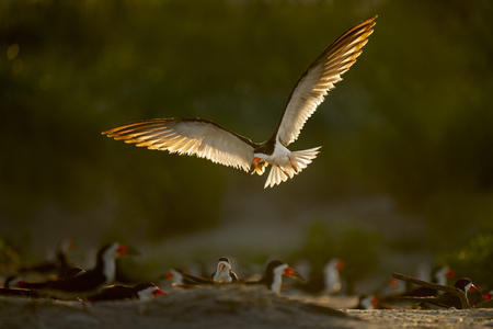 A Black Skimmer flies over the flock of other skimmers on the beach as its light wings glow in the early morning sun.