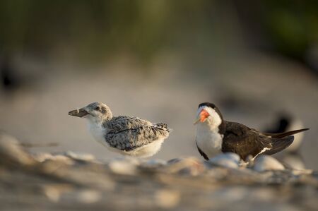 A Black Skimmer chick and an adult stand on a sandy beach covered in shells in the bright morning sunlight.